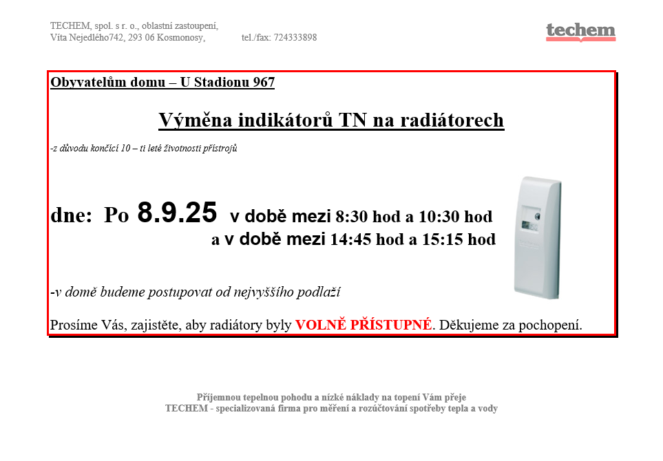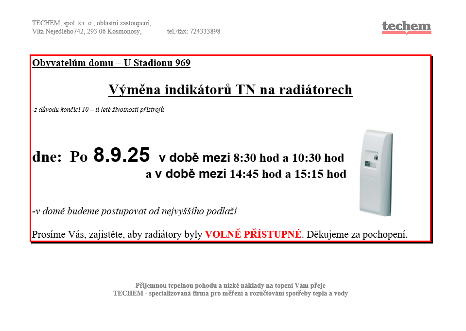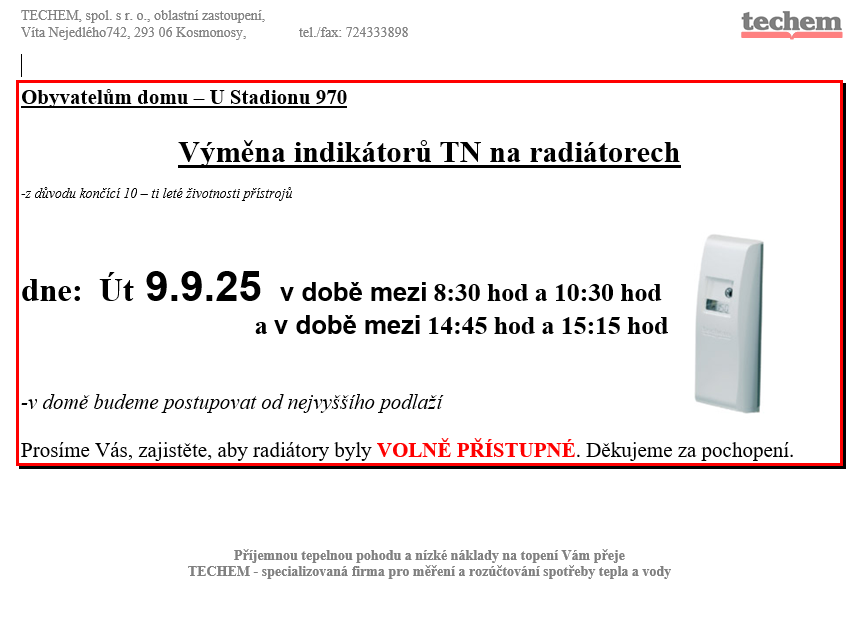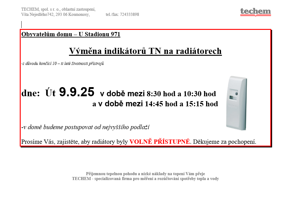 Bližší informace vyvěšeny v jednotlivých vchodech.
