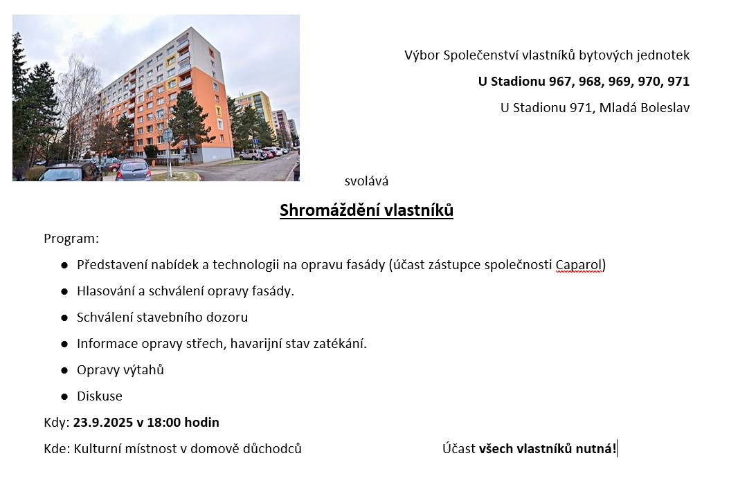 Výbor Společenství vlastníků bytových jednotek U Stadionu 967, 968, 969, 970, 971 svolává shromáždění vlastníků. Místo konání: v technických místnostech jednotlivých vchodů.